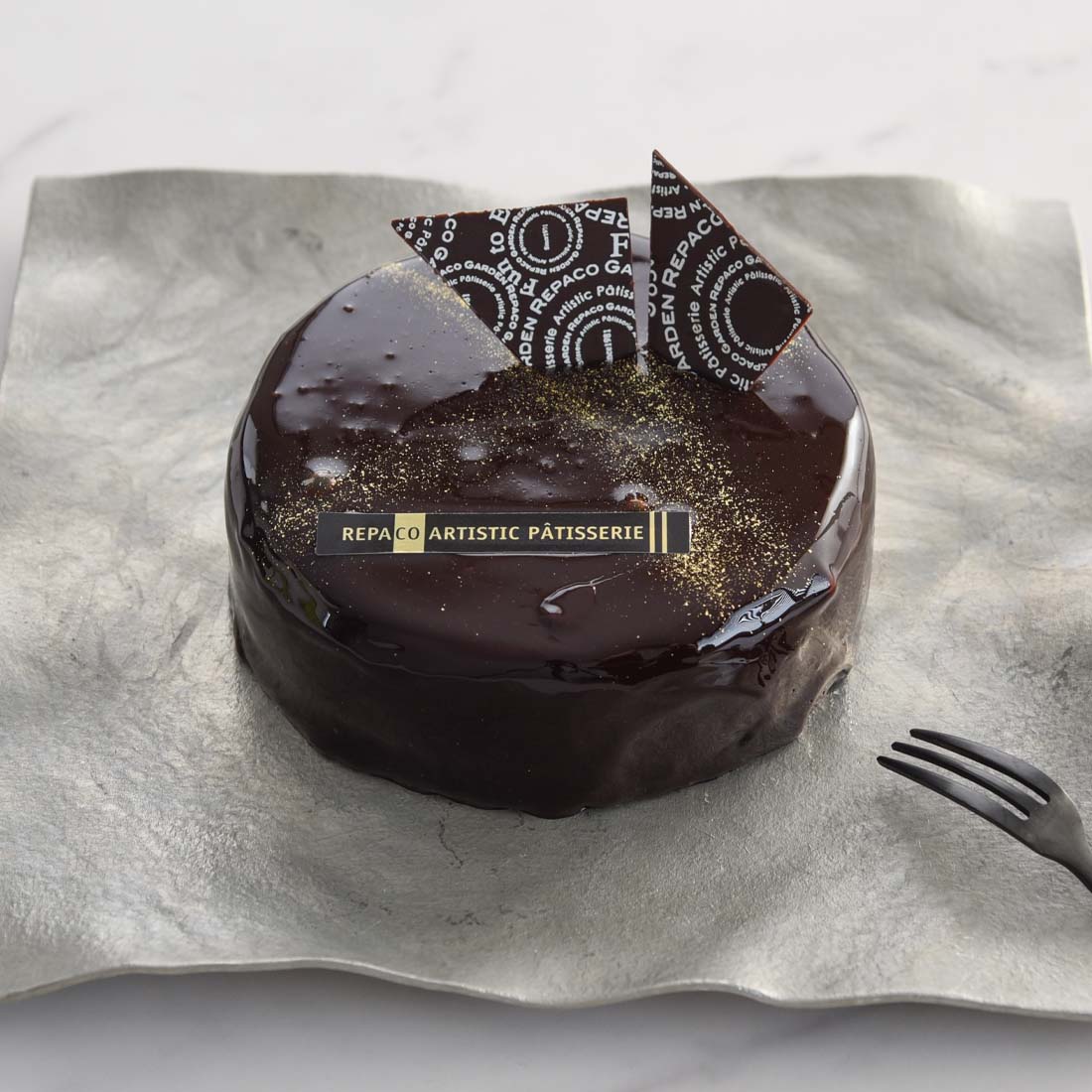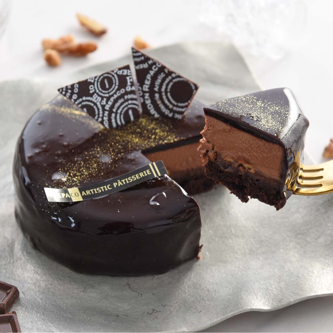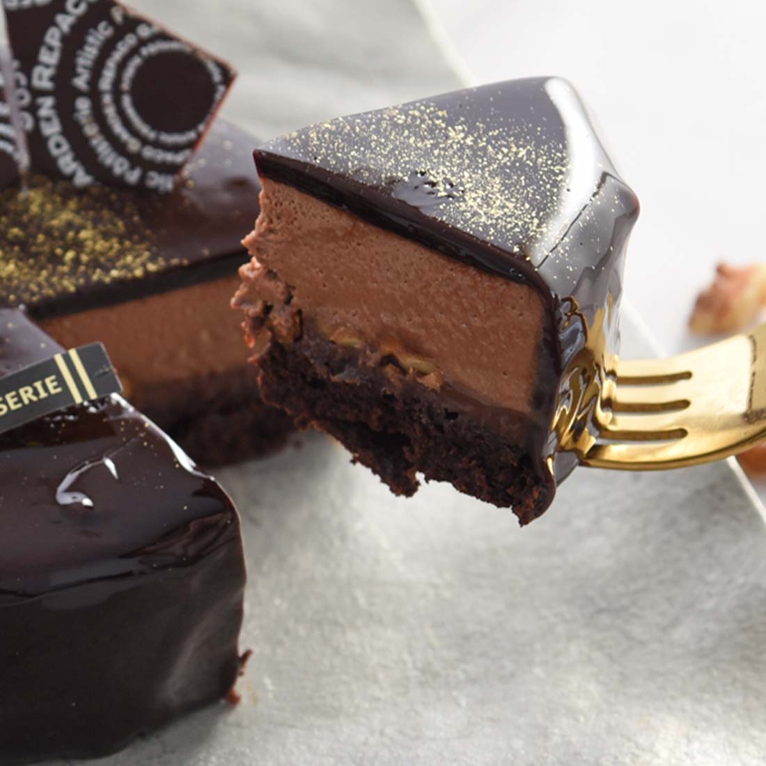 フォンダンショコラ、なめらかなガナッシュ、香ばしいクルミ、軽やかなチョコムース、そして艶やかなグラサージュそれぞれが層となって重なり合い、口の中で一体となる贅沢な構成です。